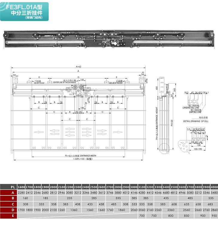 FE3FL.01A型中分三折层门装置(玻璃门结构)